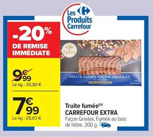 Découvrez la délicieuse truite fumée façon gravlax de Carrefour Extra, un produit idéal pour vos apéritifs ou vos repas. Profitez d'une remise immédiate de 20% sur cette spécialité de la mer, parfaite pour régaler vos invités ou vous faire plaisir. C'est une excellente opportunité pour savourer le goût riche et fumé de la truite, surtout en ces temps où la qualité et le prix comptent.