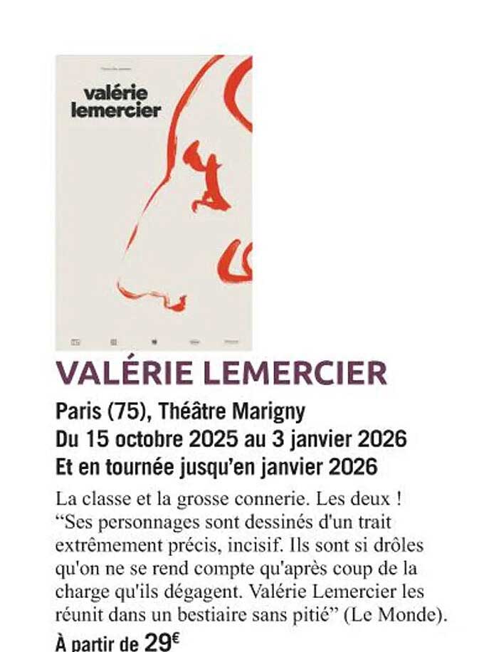 Ne manquez pas l'occasion de découvrir le spectacle exceptionnel de Valérie Lemercier, qui se déroulera au Théâtre Marigny à Paris. Du 15 octobre 2025 au 3 janvier 2026, cette comédie promet d'être un moment de pur divertissement, alliant humour et réflexion.