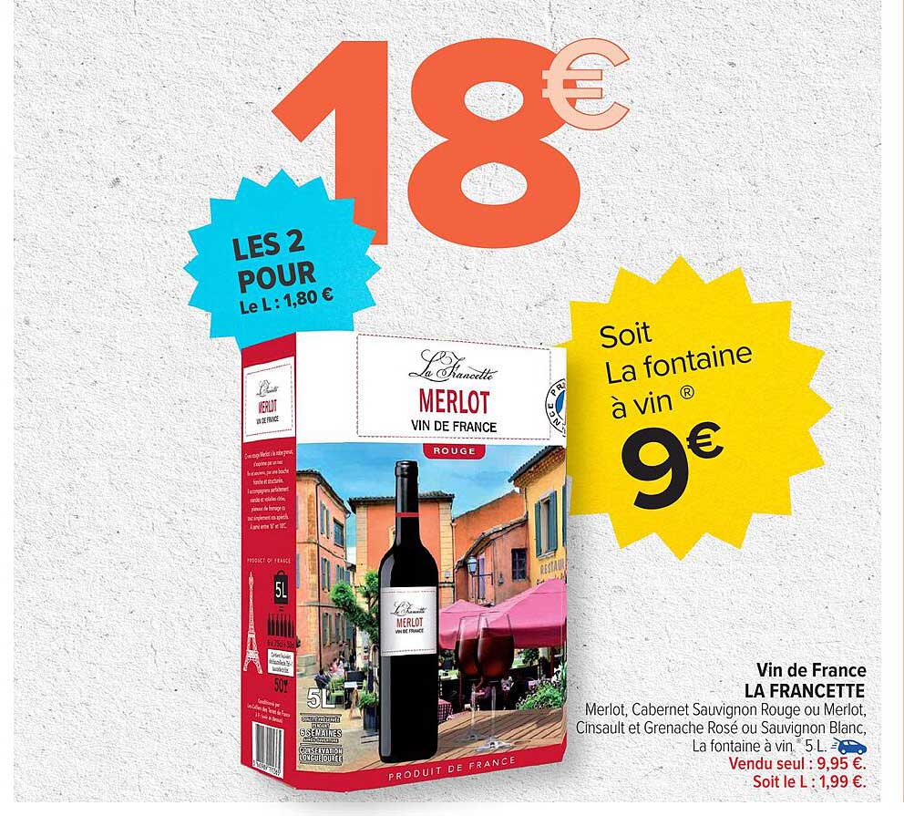 Découvrez l'offre de Vin De France La Francette chez Carrefour! Cette offre fantastique est maintenant disponible dans le nouveau catalogue de Carrefour. Profitez de cette occasion et économisez considérablement sur votre achat.