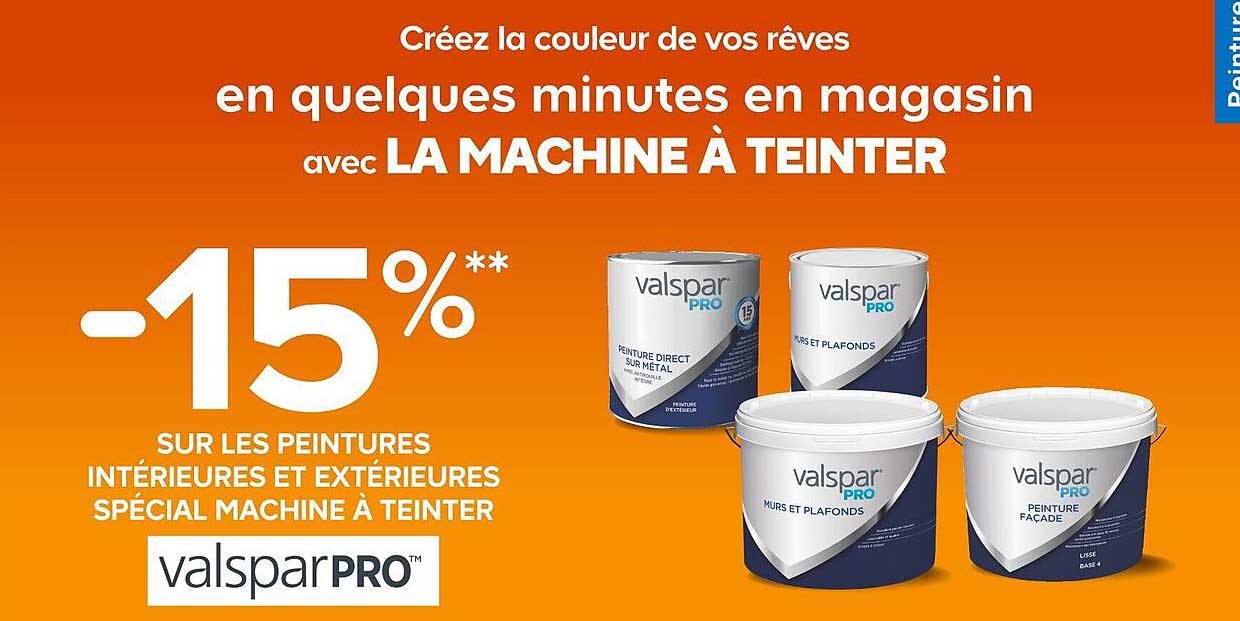 Vous avez toujours rêvé de donner une nouvelle couleur à votre intérieur ou à votre extérieur ? Cette promotion de Castorama est l'occasion idéale ! Bénéficiez d'une remise de 15% sur les peintures interior et exterior de la marque Valspar, spécialement conçues pour être teintées en magasin avec la machine à teinter. C’est le moment de laisser libre cours à votre créativité et de transformer vos espaces en un clin d'œil.