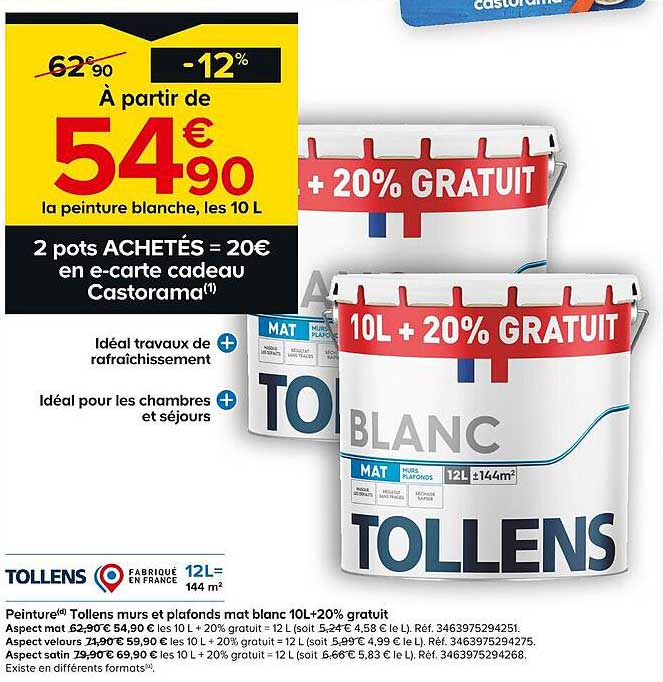 Envie de rafraîchir votre intérieur ? Cette promotion sur la peinture blanche de la marque Tollens est parfaite pour donner un nouveau souffle à votre espace. Disponible à un prix réduit, cette peinture de 10L vous permettra de sublimer vos murs tout en respectant votre budget. Profitez de cette offre incroyable entre le 15 octobre et le 3 novembre 2025.