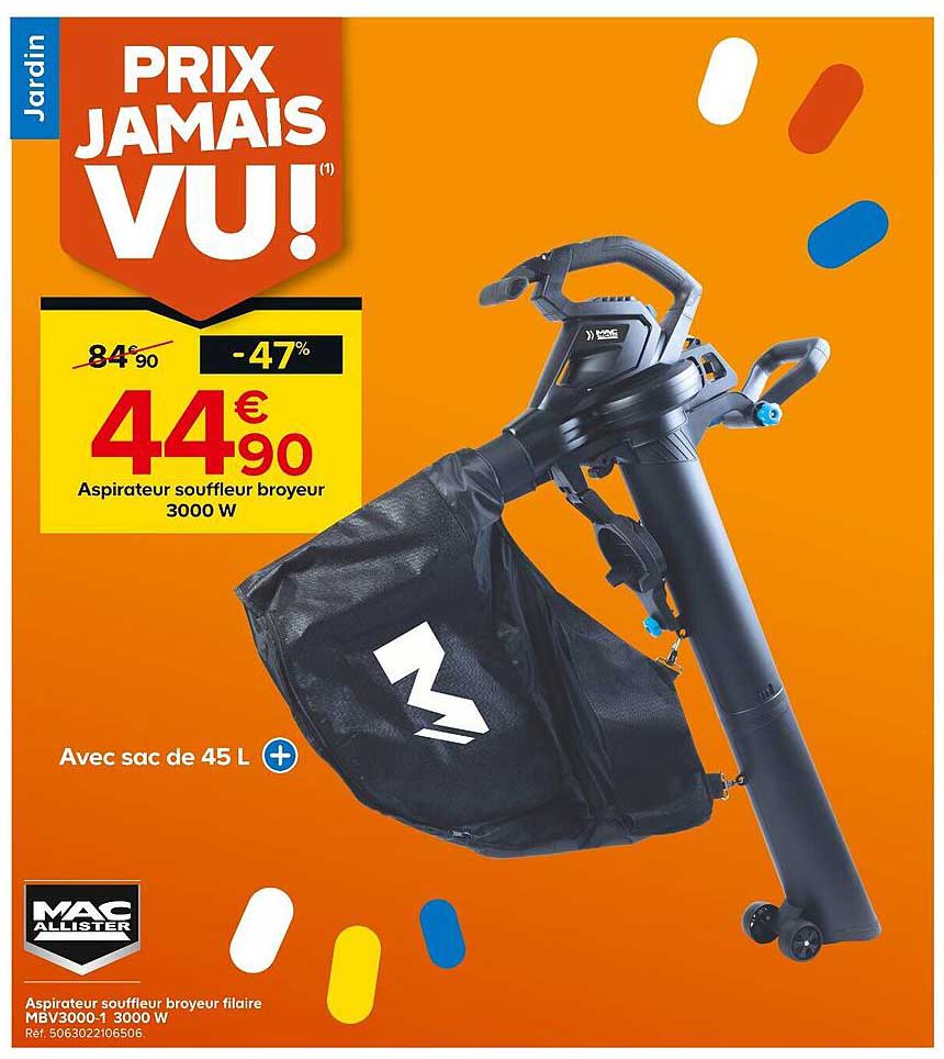 Découvrez une promotion exceptionnelle sur l'aspirateur souffleur broyeur de 3000 W de la marque Mac Allister! D'une puissance remarquable, cet appareil est votre meilleur allié pour entretenir votre jardin en un clin d'œil. Avec un prix réduit de presque 50%, c'est le moment idéal pour vous équiper et garantir un espace extérieur impeccable sans efforts excessifs.