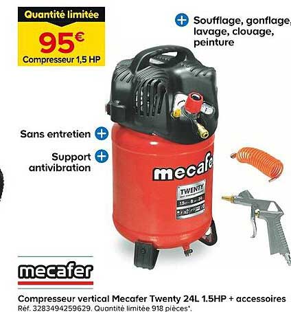 Découvrez le compresseur vertical Mecafair Twenty, idéal pour tous vos projets de bricolage, de peinture ou de nettoyage. Avec sa puissance de 1,5 HP et son réservoir de 24L, cet appareil est conçu pour répondre à vos besoins de soufflage et de gonflage avec efficacité. C'est une offre à ne pas manquer, surtout pour ceux qui recherchent la performance à un prix abordable.