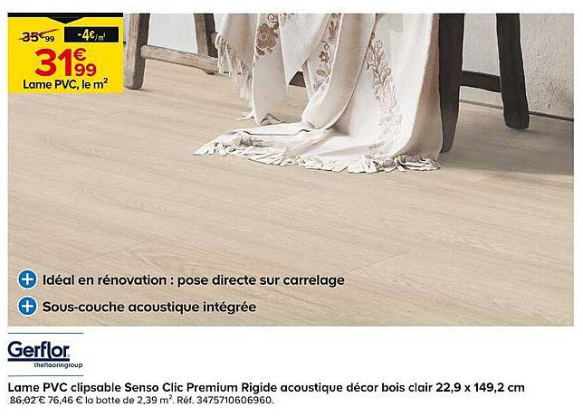 Découvrez une offre exceptionnelle sur les lames PVC clippables Senso Clic Premium Rigid au décor bois clair. Cette solution est parfaite pour tous ceux qui envisagent une rénovation, grâce à sa pose directe sur carrelage, sans complications inutiles. Profitez de la meilleure qualité tout en redonnant vie à votre intérieur.