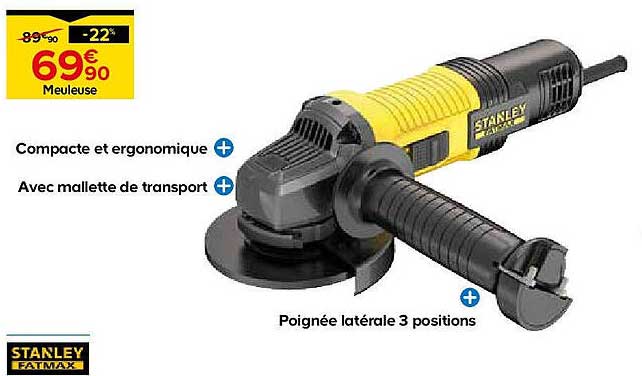 Cette offre exceptionnelle vous permet d'acquérir la meuleuse Stanley Fatmax à un prix réduit de 69,90 € au lieu de 89,90 €, soit une économie de 22 %. Ne ratez pas cette occasion d'ajouter un outil performant à votre arsenal sans faire exploser votre budget.
