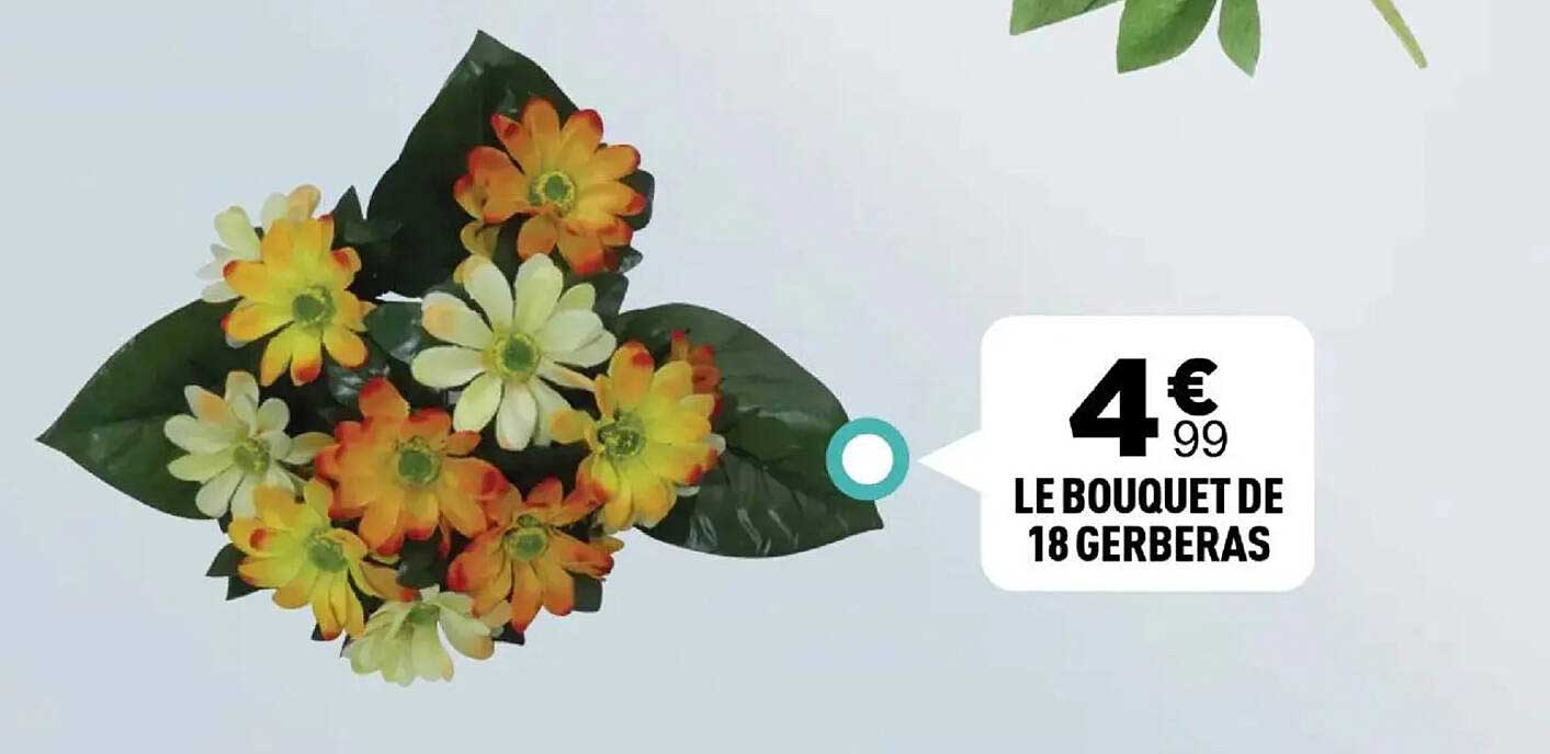Découvrez une magnifique occasion d' égayer votre intérieur avec le bouquet de 18 gerberas ! Cette offre, valable du 29 septembre 2025 au 12 octobre 2025, vous permet d'apporter une touche de fraîcheur et de couleur à votre décoration. Un vrai plaisir pour les yeux à un prix très abordable !