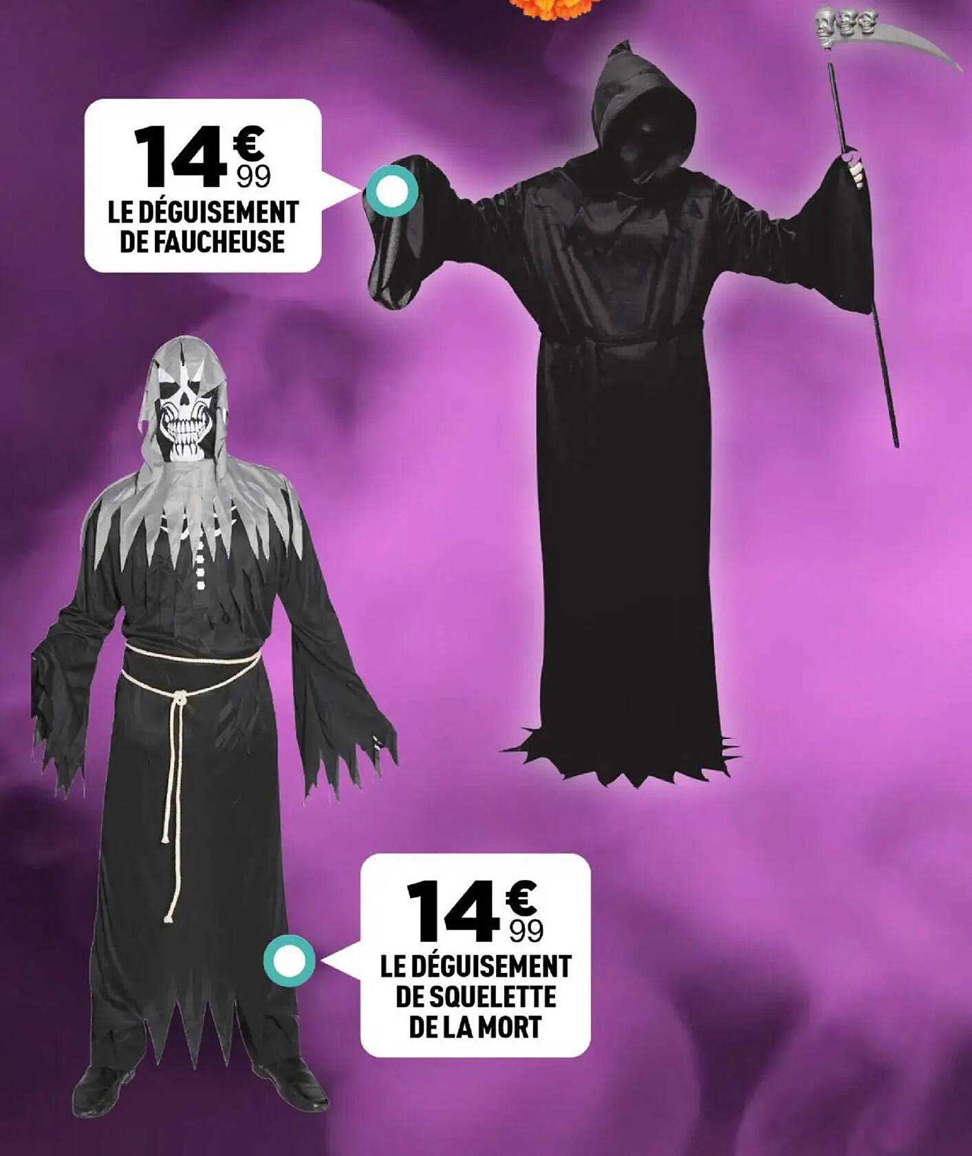 Préparez-vous pour Halloween avec une offre exceptionnelle sur les déguisements chez Centrakor ! Le déguisement de faucheuse et celui de squelette de la mort sont disponibles à seulement 14,99 €. Ces costumes sont parfaits pour des soirées effrayantes ou pour faire sensation lors de la traditionnelle chasse aux bonbons !