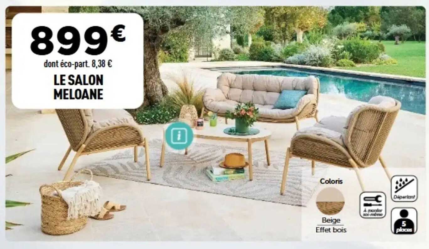 Le salon Meloane est plus qu'un simple meuble, c'est une invitation à la détente. Que ce soit pour organiser des apéritifs entre amis ou pour se relaxer après une longue journée, il répondra à tous vos besoins. De plus, grâce à son matériau déperlant, il résistera aux intempéries, vous permettant de l'utiliser en toute saison.