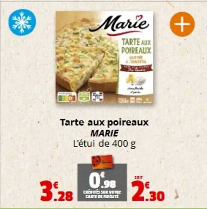 Découvrez dès maintenant la offre Tarte aux poireaux MARIE dans le catalogue de Coccimarket. Cette offre est valable du 26/03/2025 au 06/04/2025.