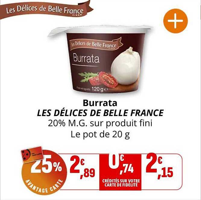 Découvrez notre délicieuse Burrata, un produit phare des Délices de Belle France. Avec sa texture crémeuse et son goût raffiné, elle est parfaite pour sublimer vos plats et ravir vos invités. Disponible en pot de 120g, cette offre est un incontournable pour les amateurs de fromage.