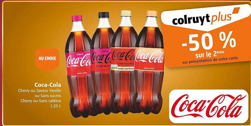 Bien que le prix exact ne soit pas mentionné, savoir qu'en présentant votre carte Colruyt, vous bénéficiez de -50% sur le deuxième Coca-Cola fait toute la différence sur votre facture. Profitez de cette promotion pour stocker vos boissons préférées, surtout lorsque les occasions festives approchent.