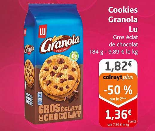 Découvrez les savoureux Cookies Granola Lu, une véritable tentation pour les amateurs de douceurs. Ces délicieux cookies aux éclats de chocolat sont la collation parfaite pour tous les moments de la journée, que ce soit pour un goûter gourmand ou pour accompagner votre café. Avec une offre promotionnelle exceptionnelle, il serait dommage de manquer cette opportunité de vous régaler !