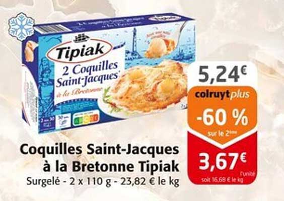Découvrez dès maintenant la offre Coquilles Saint-Jacques à la Bretonne Tipiak dans le catalogue de Colruyt. Cette offre est valable du 09/04/2025 au 20/04/2025.