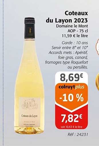 Découvrez dès maintenant la offre Coteaux du Layon 2023 Domaine le Mont AOP - 75 cl dans le catalogue de Colruyt. Cette offre est valable du 26/03/2025 au 20/04/2025.