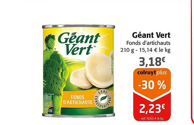 Découvrez dès maintenant la offre Géant Vert Fonds d'artichauts dans le catalogue de Colruyt. Cette offre est valable du 05/11/2025 au 16/11/2025.