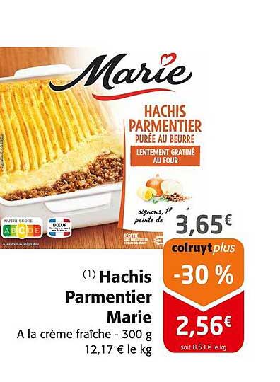 Dégustez le délicieux Hachis Parmentier de Marie, un plat réconfortant qui ravira vos papilles. Préparé avec soin, ce met est parfaitement équilibré entre une viande savoureuse et une purée onctueuse au beurre. C'est l'occasion idéale de vous offrir ce classique français à prix réduit. Ne laissez pas passer cette offre qui est valable jusqu'au 16 novembre 2025 !