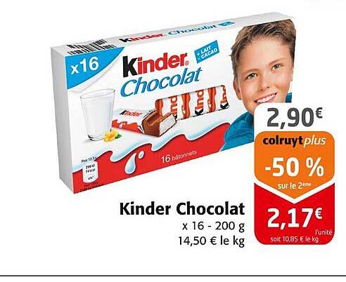 Découvrez l’irrésistible Kinder Chocolat, l’en-cas parfait pour petits et grands ! Avec 16 délicieuses barres au lait et cacao, cette offre spéciale vous permet de savourer une douceur tout en faisant des économies. C’est le moment idéal de vous faire plaisir sans culpabilité !