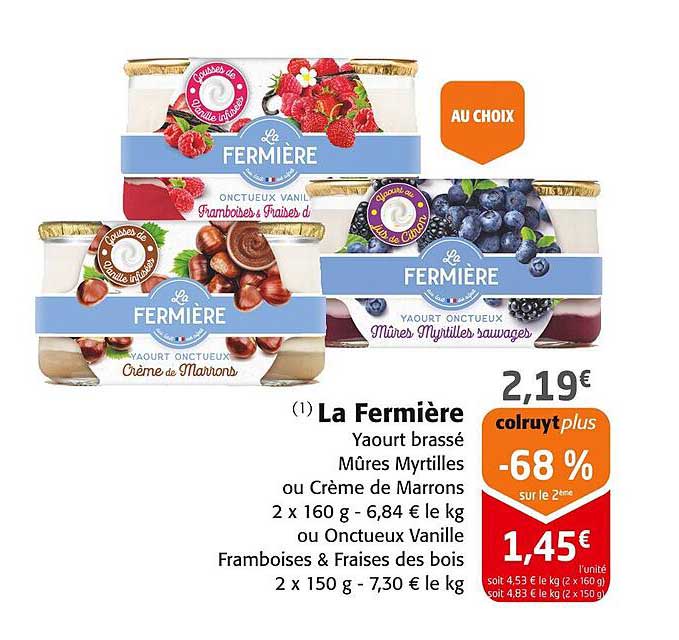 Découvrez les yaourts brassés de La Fermière, une délicieuse option pour vos petits déjeuners ou collations. Cet offre exceptionnelle met en avant des saveurs irrésistibles telles que Mûres Myrtilles et Crème de Marrons. Pourquoi résister à un plaisir qui fait du bien ? Profitez d'une texture onctueuse et d'un goût authentique pour seulement 2,19€ !