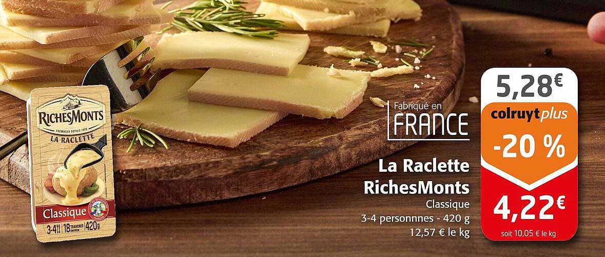 Découvrez dès maintenant la offre La Raclette RichesMonts Classique dans le catalogue de Colruyt. Cette offre est valable du 26/11/2025 au 30/11/2025.