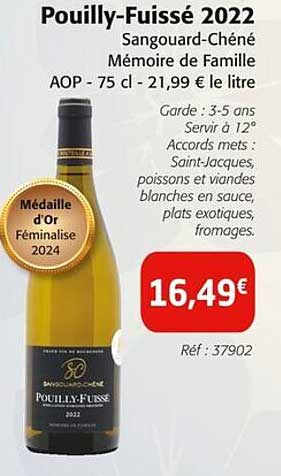 Découvrez dès maintenant la offre Pouilly-Fuissé 2022 Sangouard-Chéné Mémoire de Famille AOP - 75 cl dans le catalogue de Colruyt. Cette offre est valable du 26/03/2025 au 20/04/2025.