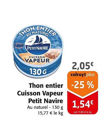 Découvrez dès maintenant la offre Thon entier Cuisson Vapeur Petit Navire dans le catalogue de Colruyt. Cette offre est valable du 05/11/2025 au 16/11/2025.
