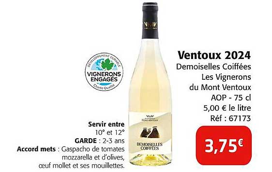 Découvrez le Ventoux 2024 des Demoiselles Coiffées, un vin AOP de la vallée du Mont Ventoux, proposé à un prix exceptionnel de 3,75 € la bouteille de 75 cl ici. Cette offre, valable du 24 septembre au 12 octobre 2025, ravira les amateurs de vin à la recherche de qualité à prix réduit.