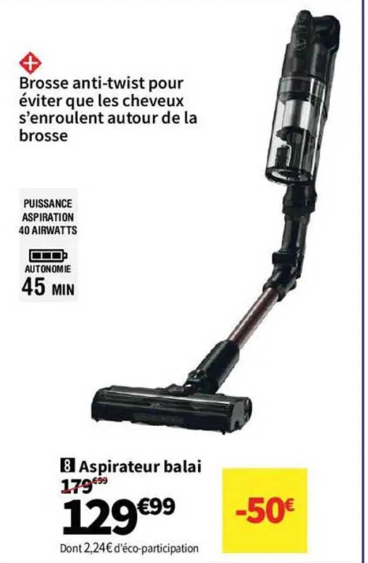 Avec une autonomie de 45 minutes, cet aspirateur est parfait pour un nettoyage rapide. Conçu avec des matériaux durables, il allie robustesse et légèreté. La puissance d’aspiration de 40 airwatts assure un ramassage efficace des salissures, même les plus tenaces.