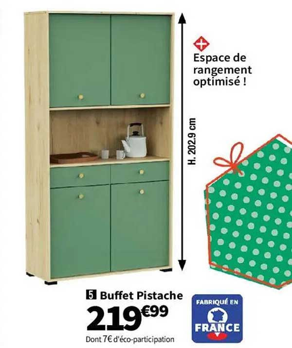 Découvrez le buffet Pistache, une pièce incontournable pour votre intérieur, alliant esthétisme et fonctionnalité. Avec ses belles finitions et sa couleur tendance, ce meuble est idéal pour apporter une touche moderne à votre salle à manger ou votre cuisine. Profitez de cette promotion exceptionnelle valable jusqu'au 25 décembre 2025.