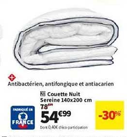 Découvrez l'incroyable promotion sur la Couette Nuit Sereine, idéale pour vous offrir des nuits confortables et réparatrices. Grâce à ses propriétés antibactériennes, antifongiques et antiacariennes, cette couette est parfaite pour ceux qui souhaitent un sommeil sain et paisible. Ne manquez pas cette occasion de renouveler votre literie avec un produit de qualité à prix réduit !