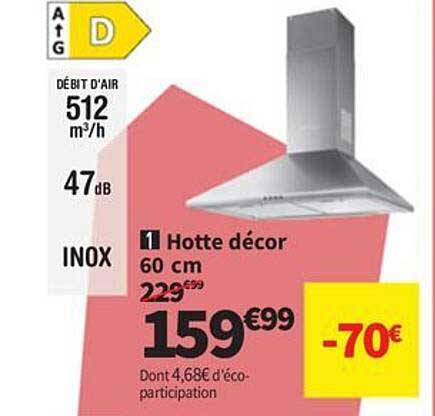 Actuellement, vous pouvez acquérir cette hotte décor 60 cm pour seulement 159,99 €, au lieu de 229,99 €. Cela représente une économie de 70 €, ce qui en fait une excellente opportunité à ne pas manquer !