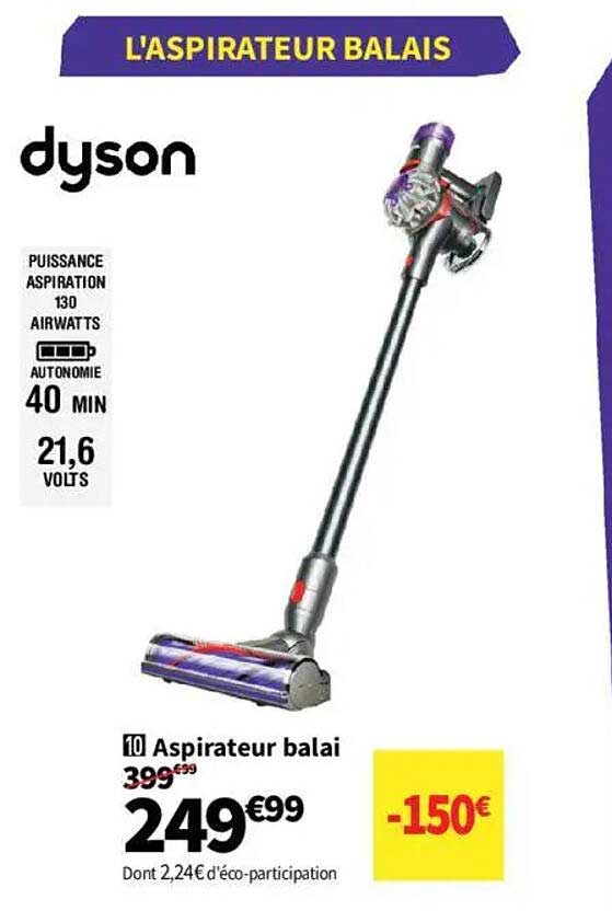 Découvrez l'aspirateur balai Dyson, une véritable révolution pour votre nettoyage quotidien. Grâce à sa puissance d'aspiration de 130 Airwatts et son autonomie de 40 minutes, cet aspirateur sans fil est idéal pour maintenir votre maison propre sans contrainte. Cette offre exceptionnelle vous permet d'acquérir cet appareil de qualité à un prix réduit, parfait pour tous ceux qui cherchent à allier performance et praticité.