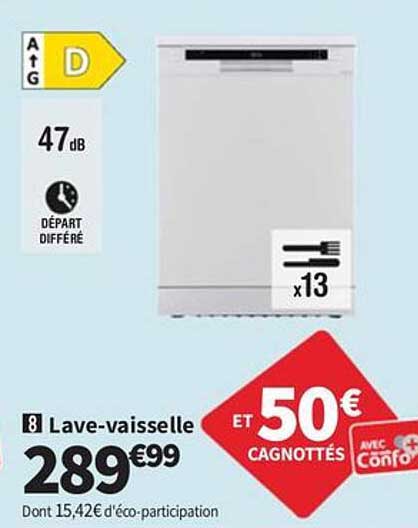 À partir de 289,99 €, cette offre vous permet de réaliser d'importantes économies comparé aux modèles similaires sur le marché. De plus, avec 50 € de cagnottés, vous bénéficiez d'un avantage supplémentaire pour vos futurs achats. Ne manquez pas cette occasion d'acquérir un lave-vaisselle performant à un prix imbattable !