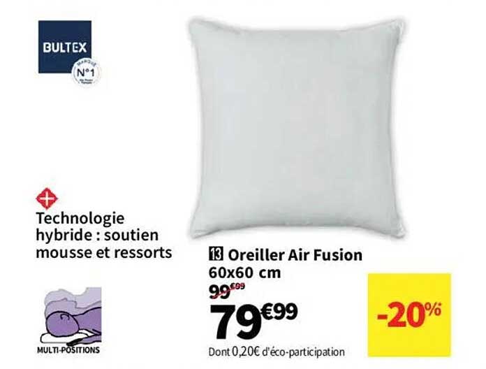 Vous recherchez un confort optimal pour vos nuits ? Ne manquez pas cette promotion exceptionnelle sur l'oreiller Air Fusion de Bultex. Grâce à sa technologie hybride, cet oreiller allie parfaitement le soutien de la mousse et le confort des ressorts. Une véritable invitation au bien-être qui transformera vos nuits en un véritable moment de détente.