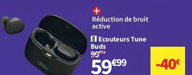 Découvrez les écouteurs JBL Tune Buds, une offre exceptionnelle qui vous permettra de profiter d'une qualité audio optimale tout en bénéficiant d'une réduction de bruit active. Grâce à cette promotion, vous pourrez écouter votre musique ou prendre vos appels sans aucune distraction. C'est l'occasion rêvée de vous équiper à prix réduit.