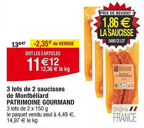 Offre de 3 Lots De 2 Saucisses De Montbéliard Patrimoine Gourmand chez Cora