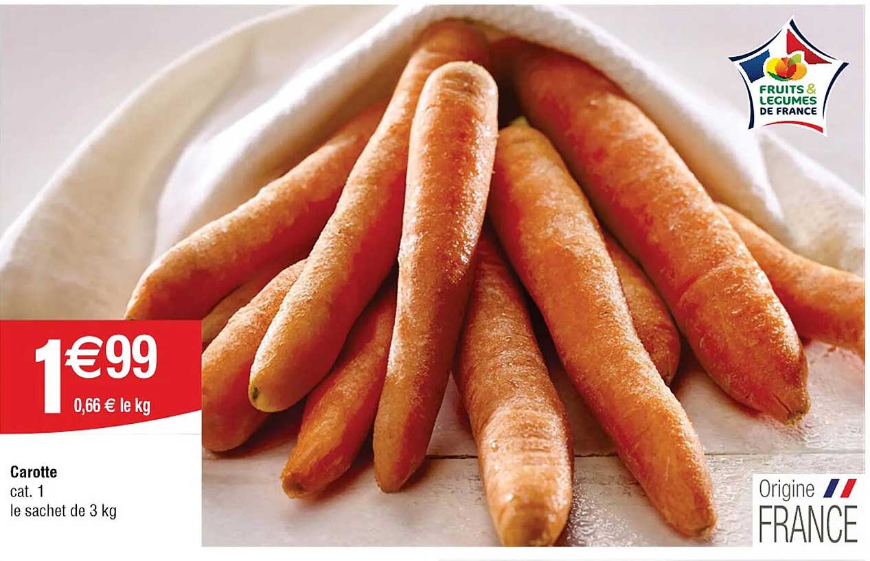 Découvrez la superbe offre de Carotte dans le nouveau catalogue de Cora. En plus de cette offre, vous trouverez de nombreuses autres réductions attrayantes. Vous pouvez facilement commander le Carotte en ligne via le site web de Cora ou l'acheter dans un magasin près de chez vous.
