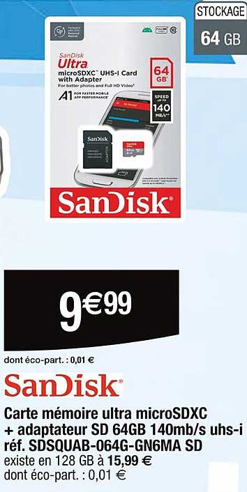 Offre de Carte Mémoire Ultra Microsdxc + Adaptateur Sd 64Gb 140Mb/S Uhs-I chez Cora