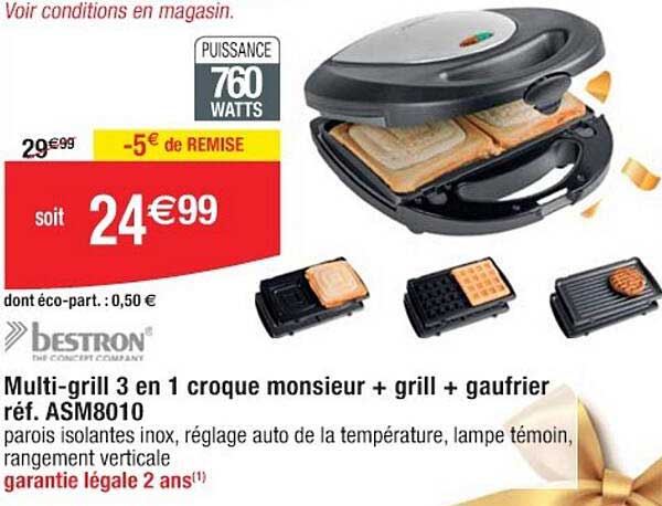 Offre de Multi-Grill 3 En 1 Croque Monsieur + Grill + Gaufrier Réf. Asm8010 chez Cora