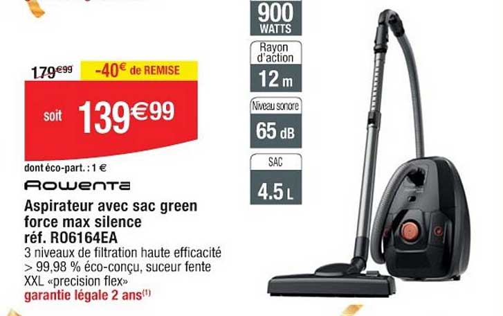 Offre de Rowenta Aspirateur Avec Sac Green Force Max Silence Réf. Ro6164Ea chez Cora