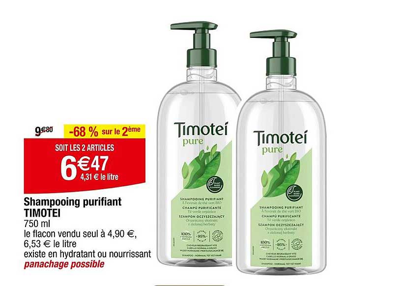 Découvrez la superbe offre de Shampooing Purifiant Timotei dans le nouveau catalogue de Cora. En plus de cette offre, vous trouverez de nombreuses autres réductions attrayantes. Vous pouvez facilement commander le Shampooing Purifiant Timotei en ligne via le site web de Cora ou l'acheter dans un magasin près de chez vous.