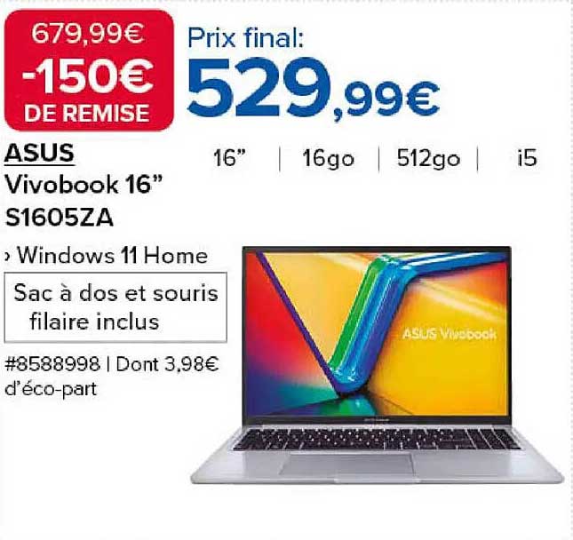 Ne manquez pas cette occasion exceptionnelle de vous procurer le nouvel ASUS Vivobook 16" S1605ZA ! Avec une remise de 150€, son prix passe à seulement 529,99€. C'est le moment idéal pour moderniser votre équipement avec un appareil performant, élégant et polyvalent.