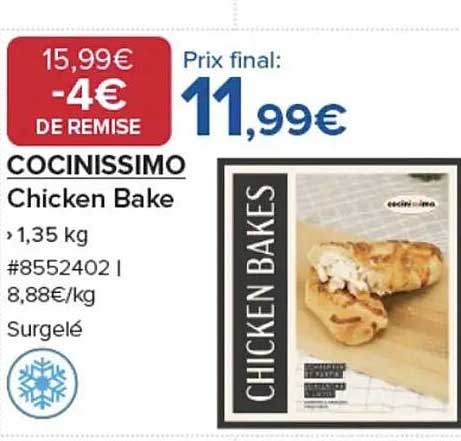 Vous cherchez un plat savoureux et facile à préparer ? Ne manquez pas la promotion sur le COCINISSIMO Chicken Bake ! Avec une réduction de 4€, ce délice surgelé est une excellente occasion de régaler vos proches sans vous ruiner. Fabriqué avec des ingrédients de qualité, ce produit est idéal pour un repas rapide les jours de semaine ou pour un repas convivial le week-end.