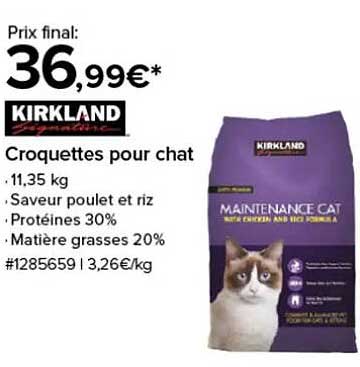 Découvrez les croquettes pour chat Kirkland, spécialement formulées pour répondre aux besoins nutritionnels de votre compagnon félin. Avec une savoureuse combinaison de poulet et de riz, cet aliment est non seulement délicieux mais également équilibré pour maintenir la vitalité de votre chat. Profitez de cette promotion exceptionnelle valable du 15 au 19 octobre 2025, parfaite pour faire le plein de provisions pour votre animal adoré.