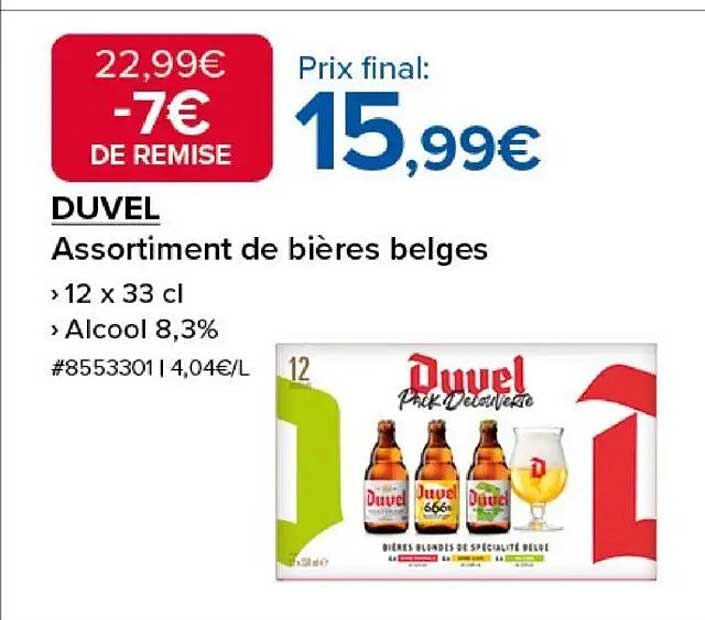 Découvrez l'assortiment de bières belges DUVEL, un véritable régal pour les amateurs de bière. Avec un prix de promotion à 15,99€, soit une remise de 7€ sur le prix d'origine, cette offre est parfaite pour agrémenter vos soirées entre amis ou vos repas en famille. Profitez de cette opportunité pour découvrir ou redécouvrir ces bières au caractère unique.