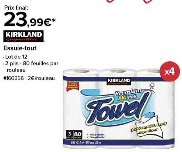 Pendant une durée limitée, profitez de l'offre exceptionnelle sur les essuie-tout Kirkland ! Disponibles en lot de 12, ces essuie-touts de qualité premium sont parfaits pour toutes vos tâches ménagères. Que ce soit pour essuyer des éclaboussures, sécher des mains ou nettoyer des surfaces, ces produits s'avèrent indispensables dans votre cuisine.