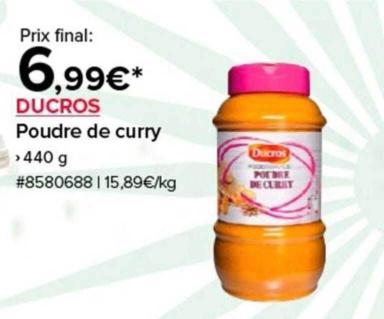 Découvrez la Poudre de curry Ducros, un incontournable de votre cuisine. Cette épice à la fois parfumée et riche en saveurs apportera une touche exotique à vos plats. Que vous soyez un chef amateur ou un cuisinier aguerri, cette offre est à ne pas manquer, valable jusqu'au 31 octobre 2025.