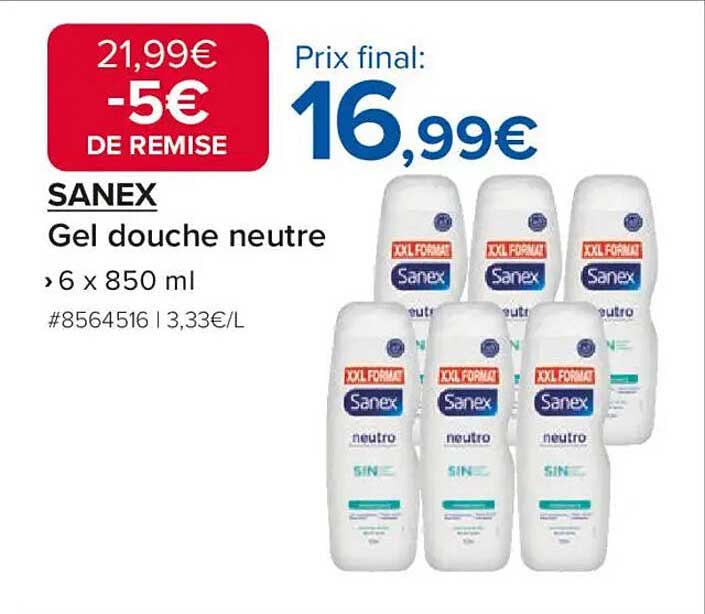 Découvrez l'offre de Sanex Gel Douche Neutre chez Costco! Cette offre fantastique est maintenant disponible dans le nouveau catalogue de Costco. Profitez de cette occasion et économisez considérablement sur votre achat.