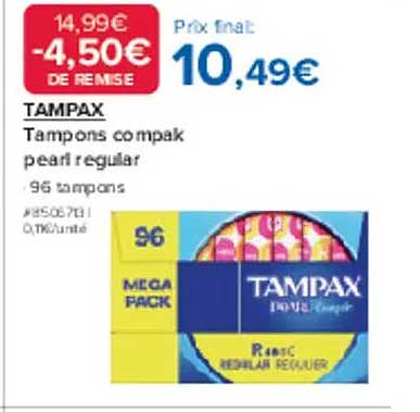 Découvrez dès maintenant la offre TAMPAX Tampons compak pearl regular dans le catalogue de Costco. Cette offre est valable du 03/03/2025 au 16/03/2025.