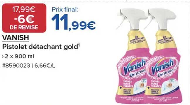 Profitez d'une incroyable promotion sur le pistolet détachant Vanish Gold, idéal pour venir à bout des tâches les plus tenaces. Pendant une période limitée, du 14 au 17 août 2025, vous aurez l'occasion de découvrir ce produit incontournable à un prix réduit. Que ce soit pour votre linge délicat ou vos vêtements quotidiens, ce détachant est un allié de choix.