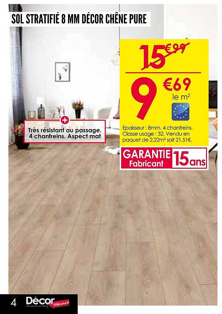 Découvrez l'incroyable promotion sur le sol stratifié 8 mm décor chêne pur, un choix idéal pour embellir votre intérieur tout en respectant votre budget. Avec une offre de 9,69 € le m², vous pouvez transformer votre espace avec style et élégance.
